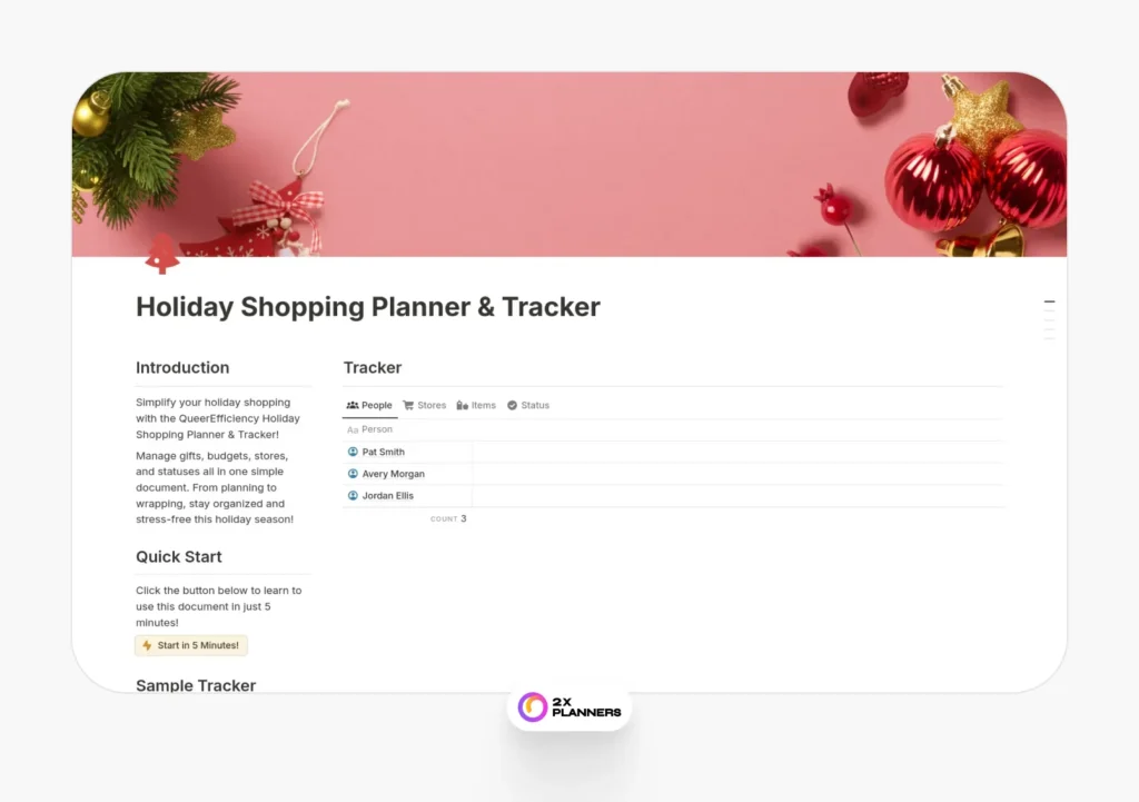 The Holiday Gift Planner Notion Template keeps your gift-giving stress-free and totally organized. Track every gift, set budgets, and see what’s bought, wrapped, or still on your list—all at a glance. Perfect for staying on top of delivery dates, shipping updates, and even personal notes for each recipient. No more last-minute shopping chaos—plan ahead, prioritize gifts, and keep your spending in check. Whether coordinating with family or managing multiple gifts, this planner makes holiday prep smooth, efficient, and actually fun.