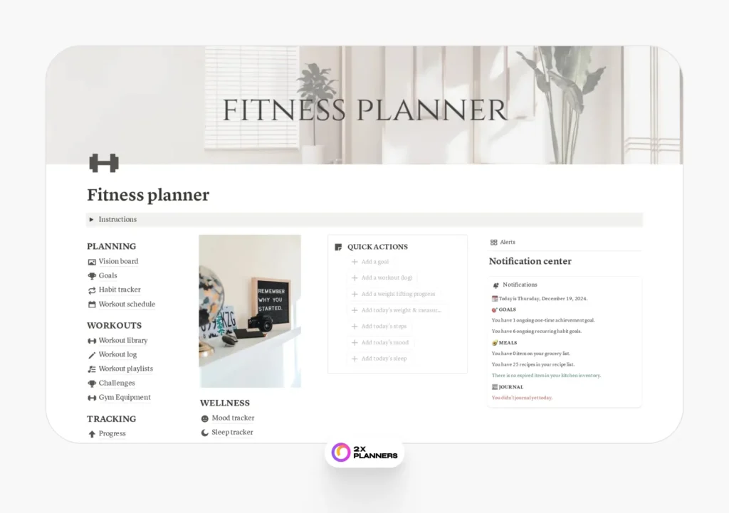 Take control of your fitness journey with this all-in-one Notion Fitness Planner. Track workouts, weight loss, body measurements, and progress photos while planning meals, supplements, and grocery lists. Build routines with habit trackers, challenges, and workout schedules, plus access a full exercise library and program templates. Keep tabs on mood, sleep, meditation, and water intake, and log your journey in the built-in journal. Automated notifications, dashboards, and calculators make managing fitness simple and stress-free. Perfect for anyone wanting a structured, flexible system to stay motivated, organized, and consistent with health and wellness goals.